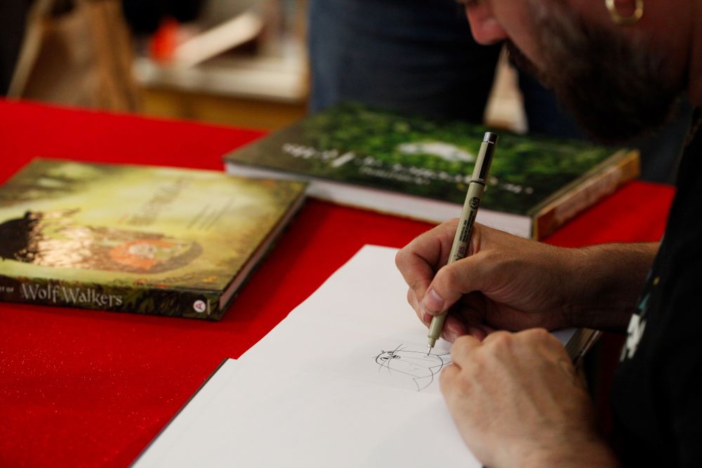 The night wrapped up with a giveaway of three prizes to three lucky attendees. First place took home an exclusive WolfWalkers print from Cartoon Saloon, while second and third places won items from our Irish Folklore Trilogy collection. To end the evening, everyone had the chance to get their journals or graphic novels signed by Tomm, who chatted with attendees and even drew a little doodle from one of his films for each person. Everyone left thrilled with their personal artwork.