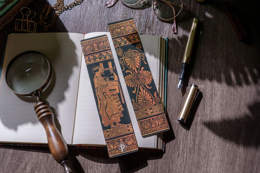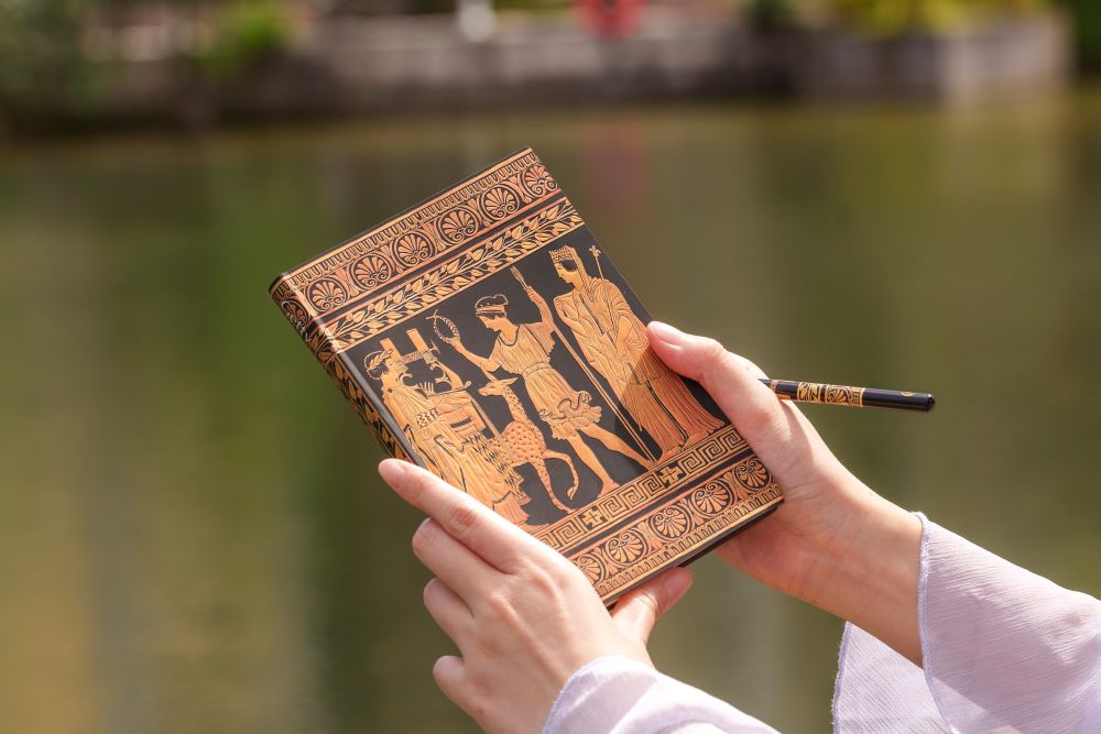 We were excited to reinterpret this artwork on a journal cover, transforming a vessel once used for mixing water, wine, perfumes, and oils into a modern companion for creativity and writing. The original function of the piece offers insight into the daily lives of the ancient Greeks, where even practical objects were infused with storytelling and symbolism. While the medium has changed, the purpose remains similar. Just as Greek pottery brought stories of gods, heroes, and epic moments to life, our Paperblanks journals invite today’s storytellers to continue that tradition through writing, reflection, and imagination.